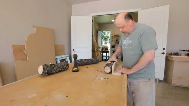 Una rama no es recta, o cuadrada o plana. Que hace realmente difícil ejecutar la a través de la mesa o sierra de cinta sierra. Afortunadamente hay una solución! Dos secciones de madera de desecho, más o menos el largo y ancho de su rama sección y atornillarlas juntas. Luego atornille la rama en el registro. Los tornillos deben ser lo suficientemente justo para perforar la corteza, pero no mucho más.