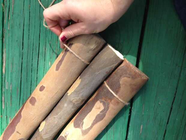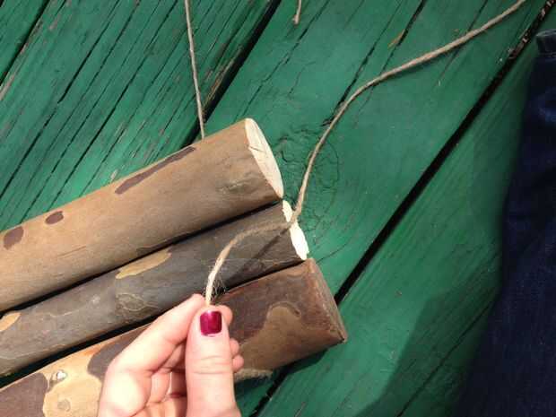 Cortar una longitud muy larga del yute. Pone detrás de las piezas de tres 26 pulgada cerca del final. Tire de la cola y tejerlos sobre y debajo de las ramas como se muestra. Hacer esto varias veces antes de atar nudos firmes 2 o tres. Repita para la parte inferior.