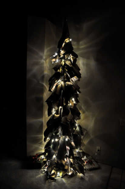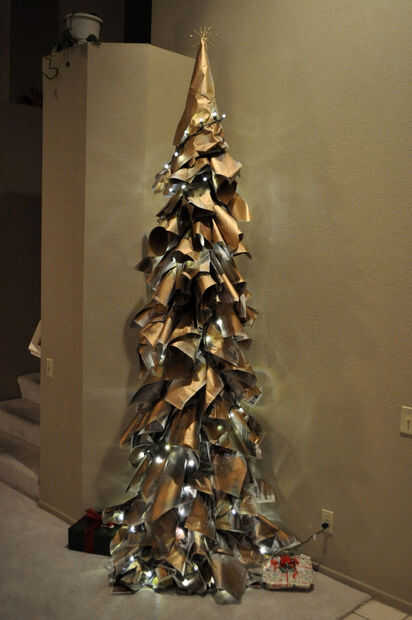 Sólo enrollada periódico en forma de cono. Grapada a un viejo post que coloca en un soporte de árbol. Aerosol había pintado los conos de oro, plata y verde y había encendido para arriba.