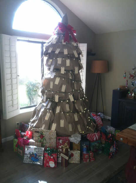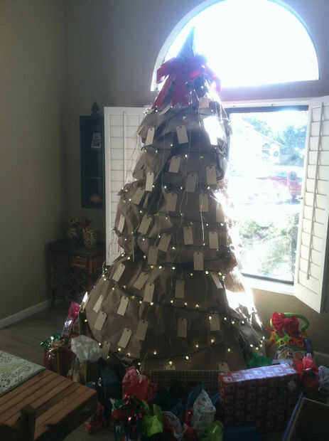 Papel de Kraft fue grapado a un poste vertical en un patrón ondulantes. Luego caliente pegué un montón de etiquetas de manila de la nave con las cuerdas colgando hacia abajo. Rematan con mis luces habituales y un arco.