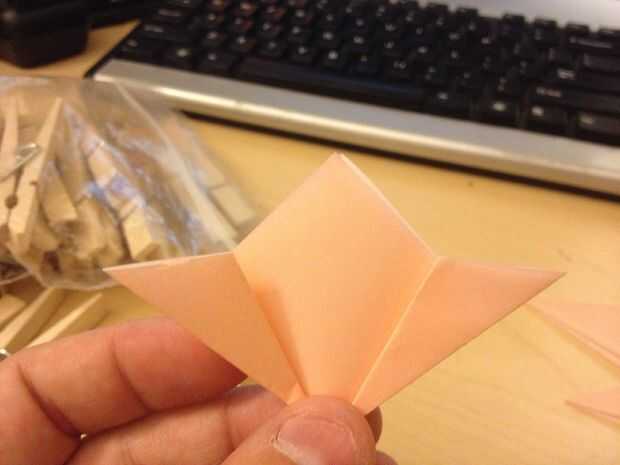 Luego doblé el interior borde de la solapa superior hacia fuera para que corrió paralelo con el borde exterior del diamante. Hice esto a ambos lados para que el diamante parecía tenía alas.
