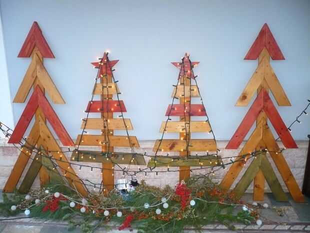 este árbol de Navidad de madera caseros fue iniciado por un edificio de una madera de base y apoyo de 1 1/2" por 5' cilíndrica poste de madera, luego cada 2 x 4 se ha reducido a varias longitudes. Un agujero se corta al final de cada pieza se deslice