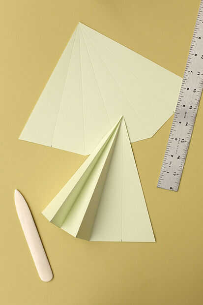 Utilizando el bolígrafo vacío, tarjeta de crédito vieja o plegadora junto con la regla, marcar las líneas de doblez (marcadas con guiones en la plantilla). Doblar el papel acordeón-estilo a lo largo de las líneas de puntuación.