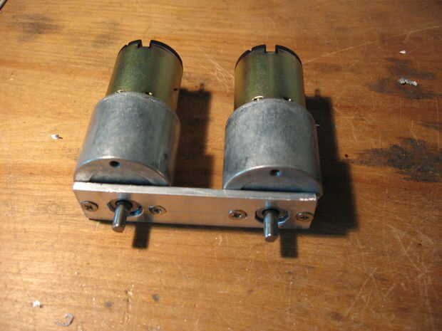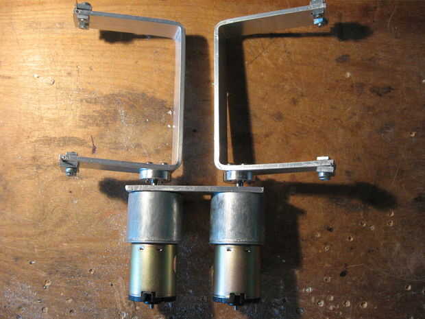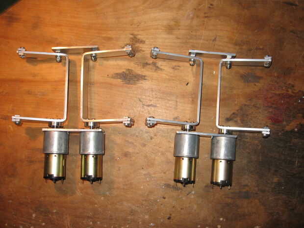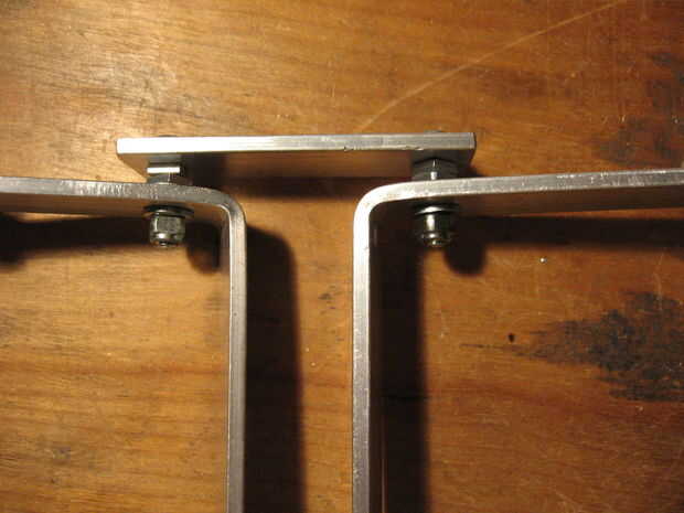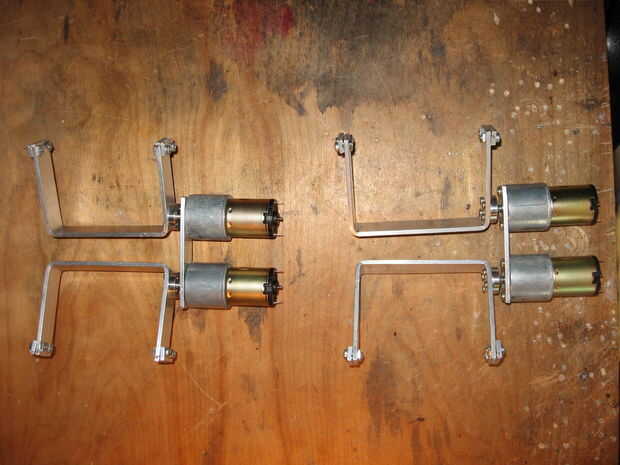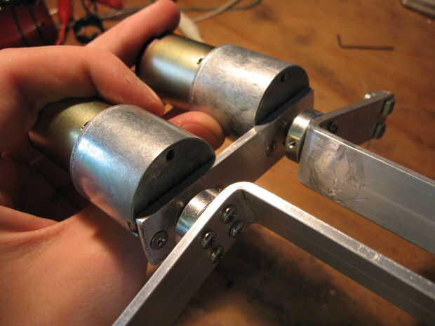 A continuación, hice una placa que empareja para el lado opuesto de la Asamblea de la pierna. Esta placa tiene las piernas rectas mientras giran. Taladré orificios a través de las piernas, frente a los ejes de motor. Entonces atornilladas las piernas a través de la placa con arandelas y una tuerca para sujetar en su lugar y que vuelta libremente sobre el perno.