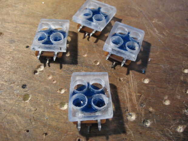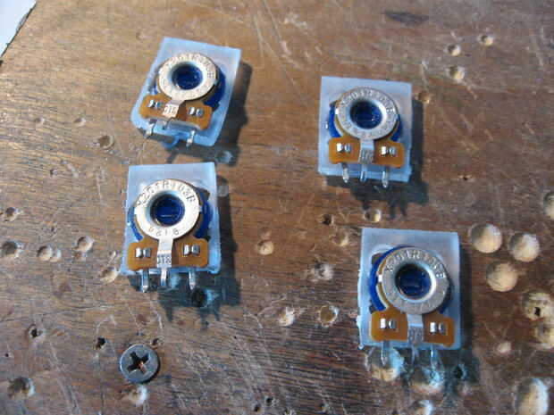 Para interfaz de las ollas y las piernas, primero lijar el lado plástico de las ollas plana. Tomé cuatro cuadrados de acrílico, aproximadamente 3/4" a cada lado y perforar cuatro agujeros en cada una, correspondientes a las cabezas de cuatro tornillos en cada pierna. Luego pegué un potenciómetro en el centro de cada cuadrado de acrílico.