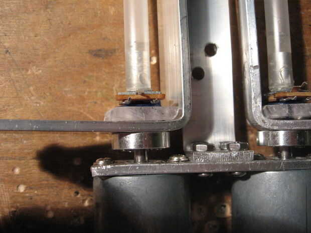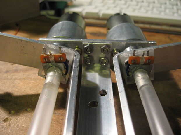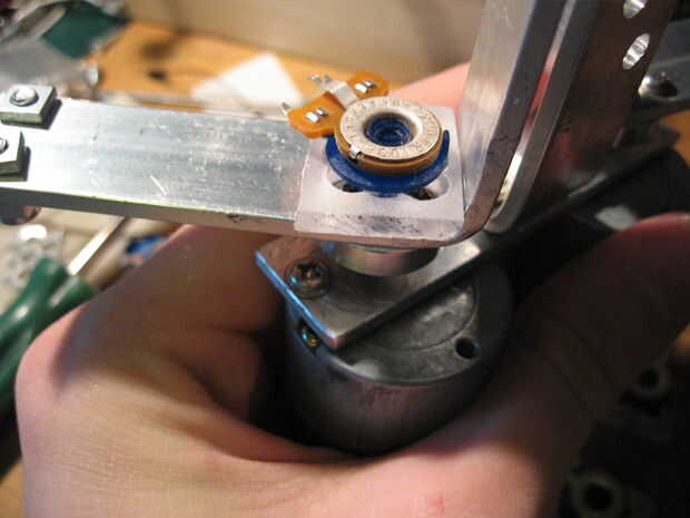 Mientras que el diseño y construcción de los conjuntos de las patas, descuidado construir de forma sencilla para conectar los potenciómetros para las piernas. En la solución que se me ocurrió, un lado del bote se fija en el interior de la pierna por la cabeza del tornillo que sobresale. Al otro lado del bote se fija a la tuerca en el extremo del perno que sujeta la pierna en su lugar. Cuando la pierna se gira, al lado de la olla que se fija a las vueltas de la pierna, mientras que la parte fija a la tuerca de fijación se lleva a cabo en el lugar.