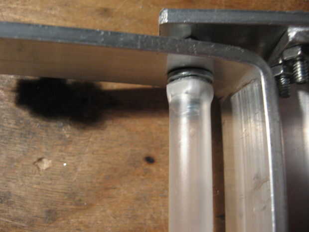 Para fijar el lado opuesto de las ollas a la tuerca de seguridad que tenía que ser aún más creativo. En primer lugar, pegué separadores de metal podridos de un caso de PowerMac G5 para el lado del metal de las ollas. Luego pegué la varilla de plástico de un bolígrafo Bic para el lado del metal de las ollas. Los otros extremos de cada corral fueron cortados para caber dentro de las piernas del metal. Entonces el eje de la pluma era forzado sobre la contratuerca cuadrada y ajustaron a él.