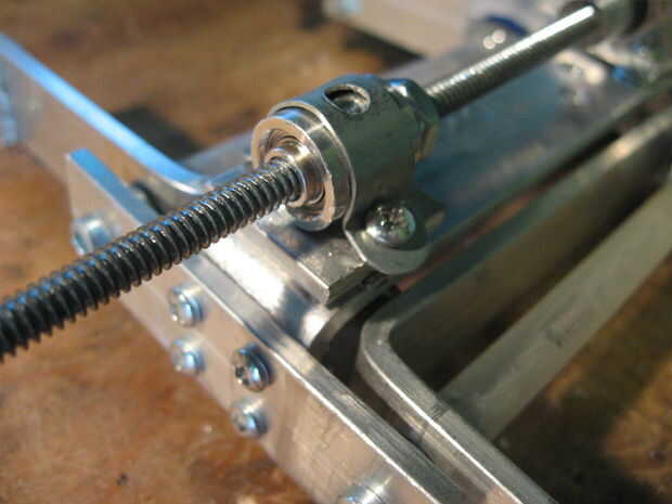 Con sólo el acoplamiento, eje de rosca con el todavía no puede llevar carga, porque sólo le tire el motor. Para soportar carga, hice un cojinete para el eje de un antiguo cojinete cabeza de lectura/escritura de disco duro. Taladró el centro por lo que podría pasar la varilla roscada a través de él. Luego alimenta la varilla a través de él y sujeta una tuerca en cada lado del rodamiento, para fijar la varilla roscada. Entonces había atornillado el rodamiento hasta la parte posterior del armazón del robot.