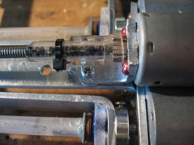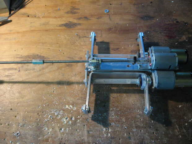 Hay unos problemas con conseguir una columna roscada a girar suavemente. En primer lugar, se debe estar conectado al motor bien y en segundo lugar debe tener alguna clase de cojinete fijada a él en el cual puede girar. Una de las primeras cosas que encontré al intentar acoplar el eje del motor a la varilla roscada fue que la conexión debe ser flexible para la operación lisa. Hice mi acoplamiento de dos segmentos de tubo de nylon transparente. Un segmento más amplio de diámetro se ajusta firmemente sobre el engranaje unido al eje del motor, mientras que un segmento más fino encaje en el tubo más grande y firmemente sobre la parte exterior del rosca del eje. El acoplamiento se asegura con una atadura.