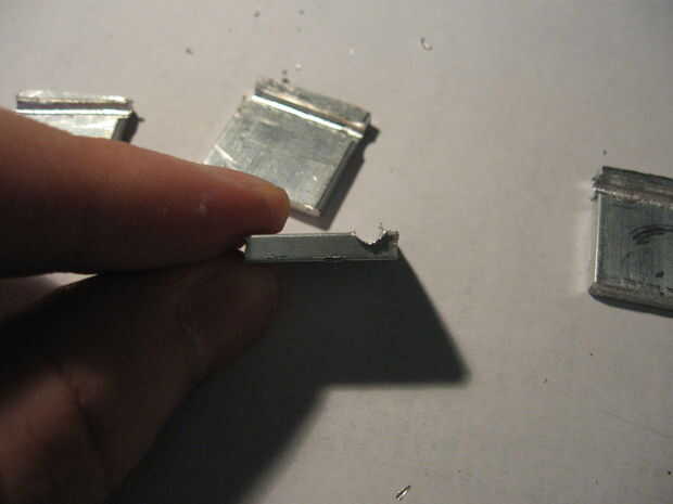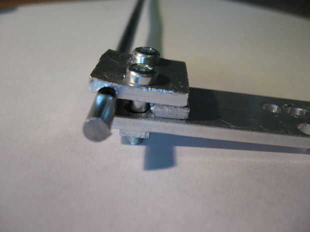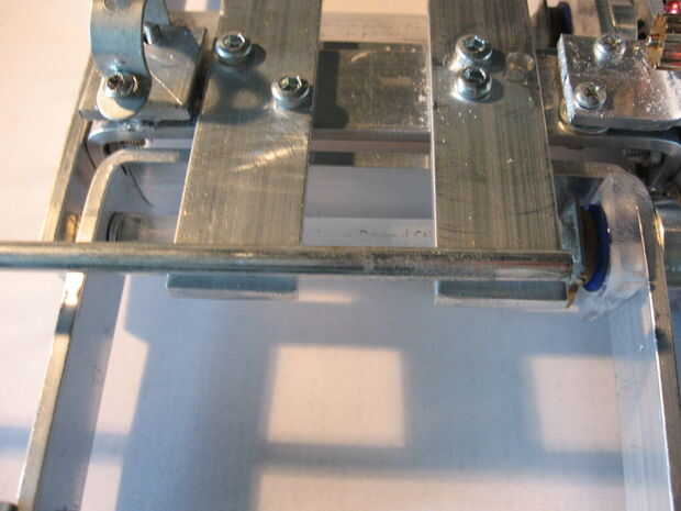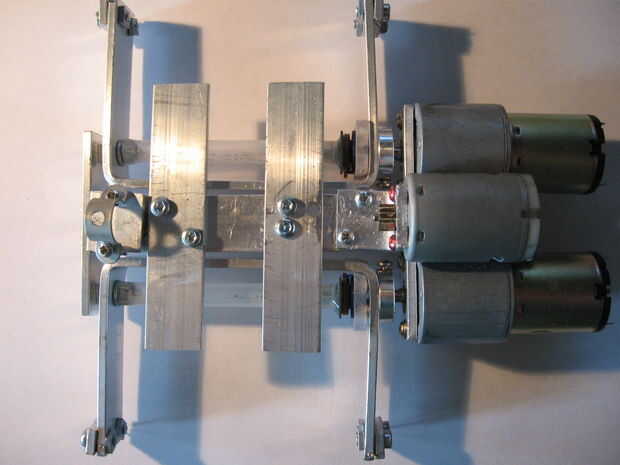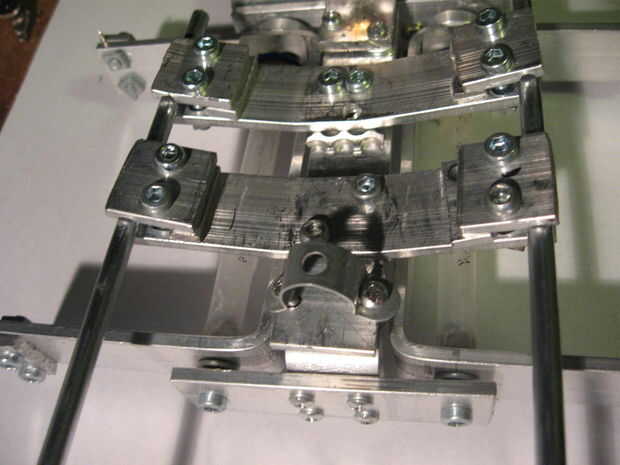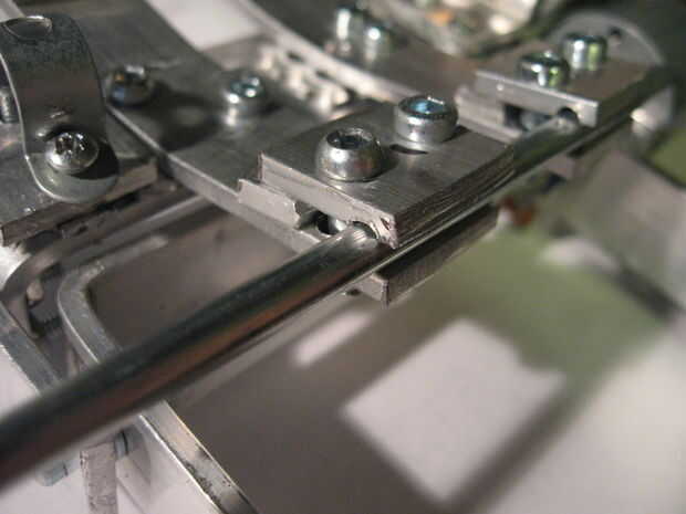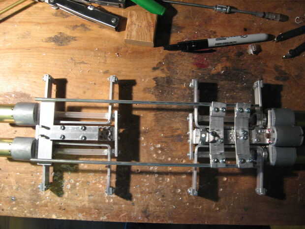 En primer lugar, he añadido un par de barras de aluminio para el segmento del robot sin la electrónica, para igualar el par en el otro segmento. Para montar las varillas de acero y el latón de la tubería a estos, hice un sistema de sujeción similares a las pinzas sujeta los pies en su lugar. Para hacer esto para las barras de gran diámetro, sujeta primero dos cuadrados de 3/4" de aluminio juntos. Luego perforar un agujero de 1/8 hacia abajo de la intersección de las plazas y luego los llevó aparte. Perforé dos agujeros en cada plaza y los agujeros correspondientes en cada brazo del soporte. Entonces repetí el proceso cuatro veces. Para obtener las diapositivas perfectamente paralela a la varilla roscada, tuve que doblar los brazos de soporte en el segmento no electrónica del robot.