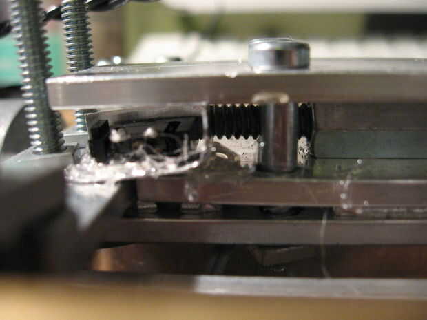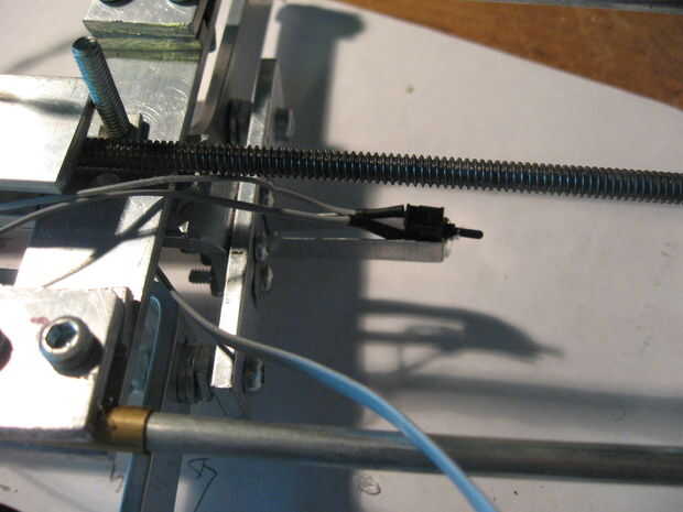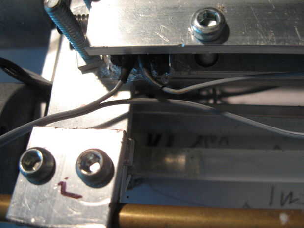 La columna vertebral tiene dos interruptores de límite. Uno es presionado cuando los dos segmentos del robot se tiran juntos, y el otro se convierte en no presionado cuando la varilla roscada se retrae más allá de ella. Este último es un cambio como este pegado paralelo a la varilla roscada, en el segmento del robot con la electrónica. Cuando la columna se retrae, empuja hacia abajo la palanca del interruptor, y cuando se retrae, el interruptor se abre.