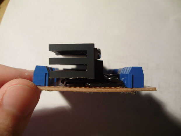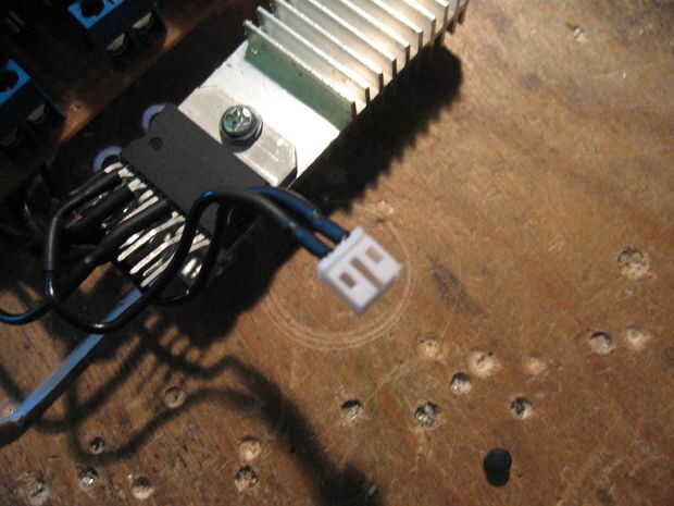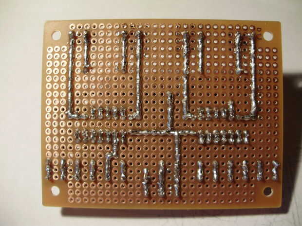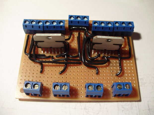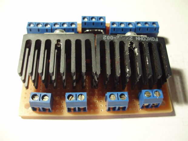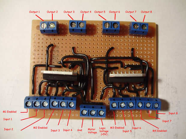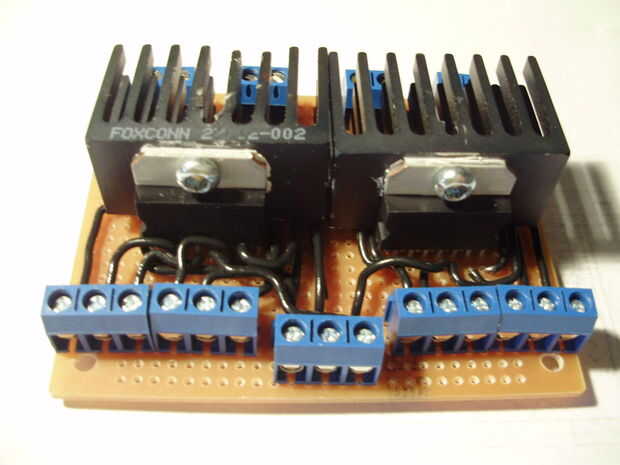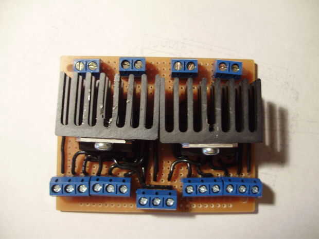 aquí. Para empezar, he puesto todos los componentes en un pedazo de tablero de perf, averiguar la disposición. Con este chip, cada motor requiere de tres insumos para trabajar: una señal de enable y dos señales de entrada. La señal de enable se utiliza para controlar la velocidad del motor con PWM, pero puesto que no necesito al control PWM, sólo con cable todos los bolos de activar en paralelo a una línea de 5V cuando conectado el controlador hasta el Arduino. Una vez me di cuenta de la disposición, soldar todos los componentes en su lugar y realizar conexiones con cable de núcleo sólido 22AWG. Por último, difundir algunos pasta térmica en la parte posterior de los L298 y atornillados a los disipadores de calor. Los disipadores de calor particular utilicé hicieron cortando por la mitad un disipador northbridge de una placa base del ordenador y perforación y roscado un agujero para el tornillo. Son probablemente mucho mayores de lo necesario, pero no hay nada de malo en tener sobre disipadores de calor de tamaño. Una mayor resolución de imagen de la Junta Directiva etiquetada puede encontrarse
