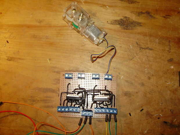 Cuando haya terminado, este regulador del motor debe ser capaces de forma bidireccional control 4 motores de la C.C. en hasta 2A cada (probablemente 2A continuamente, debido al tamaño de los disipadores de calor). Como puede notar, esto me deja un motor corto. Mi diseño original utiliza un servo para accionar la columna vertebral, pero tuve que cambiar mi diseño a usar un motor de DC. Para energía, yo por cable mi tercer chip L298 a un conector molex (así puedo desconectar el motor) y soldar los cables para las conexiones. No se ve tan bonito como mi controlador en un tablero de circuito, pero funciona.