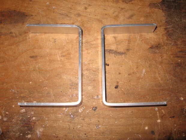 Para hacer las patas, cortar 4 8.5" longitudes de la barra de aluminio. Marqué los segmentos de 2.5" de cada extremo. En esas marcas, doblaron el aluminio en ángulo recto, para hacer una forma de "U". Si no tienes un soporte curvado (que no) puede obtener una curva limpia el aluminio con una abrazadera en c de sujeción en la marca, y empujando el extremo liberado contra una superficie sólida, como un banco de trabajo.