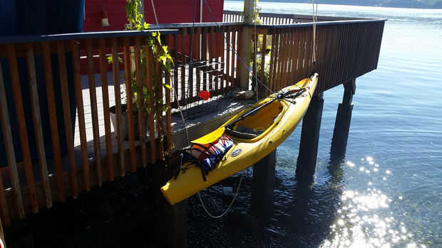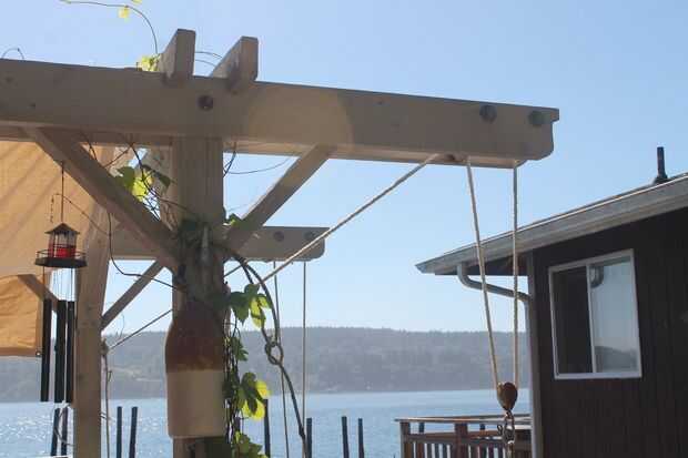 Desarrollamos la idea de un eje barco ascensor/pescante después de ver varios ascensores de barco histórico e inspirado generalmente por jardín cenadores en nuestra área. Esta elevación no manejar barcos grandes o pesados y no está diseñado para soportar el peso de personas en botes, sin embargo ha sido de gran ayuda en conseguir pequeñas embarcaciones como mar kayaks dentro y fuera del agua en las mareas varios y tal vez más importante parece un árbol de jardín agradable y sin pretensiones cuando no esté en uso... De hecho es nuestro apoyo para el cultivo de lúpulo y sirve para el almacenamiento adicional para los hallazgos de la playa y puede doblar para un parasol colgando una lona lona sobre él en tiempo caliente. Incluso se utiliza para levantar trampas de cangrejo y varios cambios dentro y fuera de los barcos.