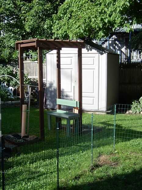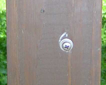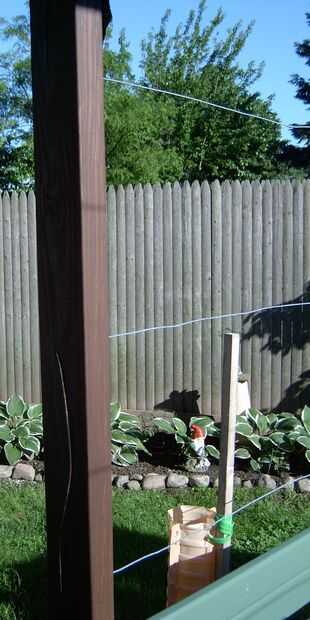 Os adjunto el alambre galvanizado a cada lado de la rejilla para entrenarse las vides. I marcha 20" desde el fondo y sobre cada 12" a la parte superior, perforados agujeros en todos los cuatro mensajes. Tire el cable a través de a partir de la parte posterior y fijación final torcer alambre con punta de aguja ruido alicates en apretado círculo y fijándolo a la madera con tornillo y arandela. Enrosque el cable hacia delante tirando firmemente hasta llegar a los últimos post y ate como en el principio con el tornillo y la arandela. Terminé con 5 filas de alambre.