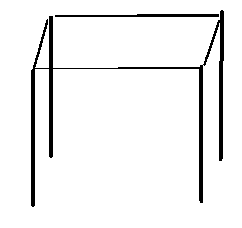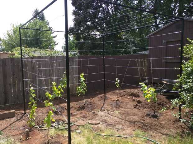 La idea es construir una estructura de cubo, con líneas en 3 lados por lo que las uvas pueden crecer y de un lado para poder entrar bajo el cenador y hacer un picnic a la sombra, algo como esto: