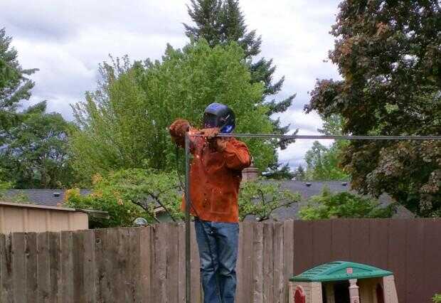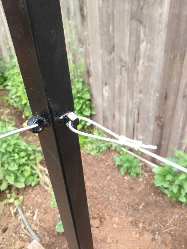 Para sujetar los cables para las vides que crecen, soldado con autógena algunas tuercas en la estructura metálica irá a través de ellos.