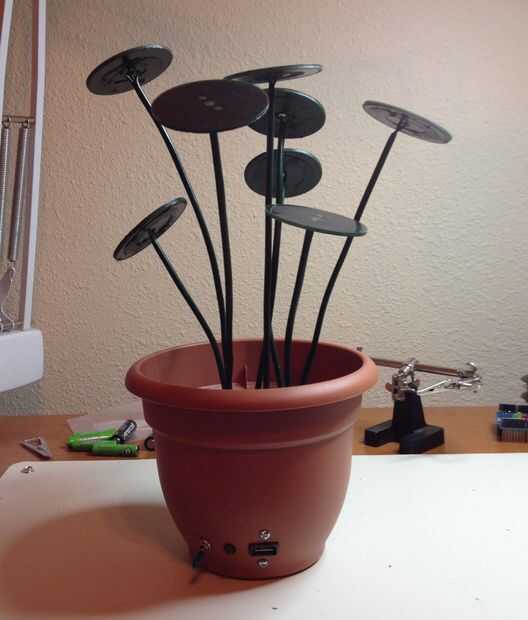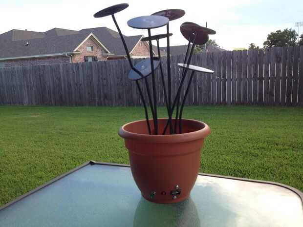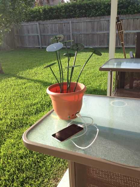 Llamo a mi creación "Arbusto Solar". Ha diseñado para parecerse a una planta de hojas redondas en una maceta, pero a diferencia de una planta real, éste puede cargar mi iPod, iPhone y cualquier otro dispositivo USB cargable.