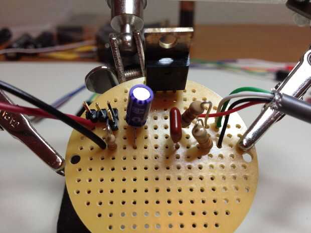 9. Conecte el cable negro (GND) y crear un "autobús tierra" a través de la parte posterior del tablero del circuito para conectar todos los componentes.
