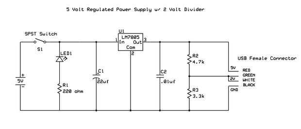 El circuito es muy simple basado en los 5 7805 regulador de voltios con el apoyo de los componentes y un divisor de voltaje a 2 voltios de la fuente mencionada.