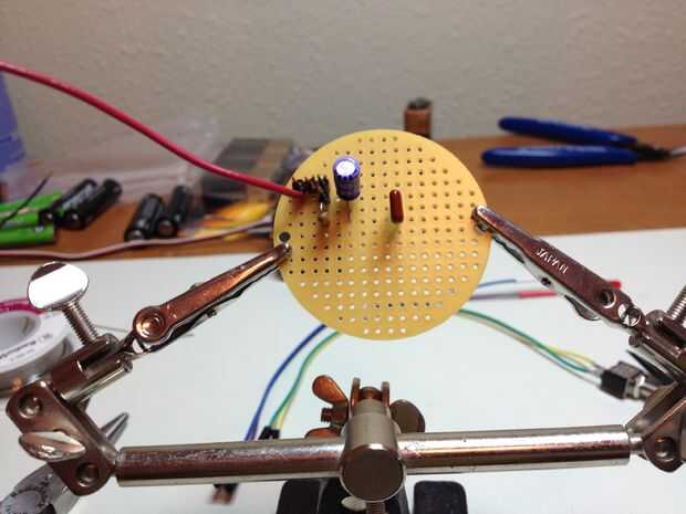 4. soldadura de los dos condensadores. C1 se polariza así que asegúrese de configurar correctamente.
