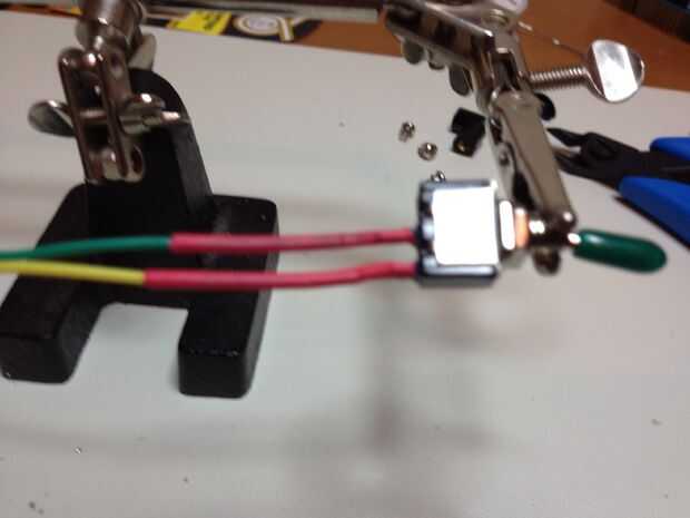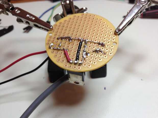 1. soldar el cable rojo (eventualmente se conectará al borne positivo de la matriz celular) a la placa de circuito y a un lado de un enchufe de dos pines (para el interruptor de encendido).