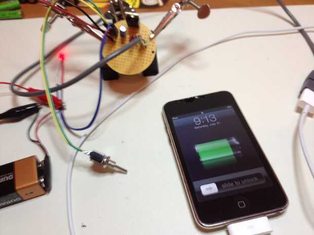 11. el circuito de prueba. Me gusta probar cosas como ir a lo largo en vez de esperar a que todos junta la cosa. Había conectado a una batería de 9 voltios a los cables rojo y negro y me había probado el circuito con mi iPod. Éxito!