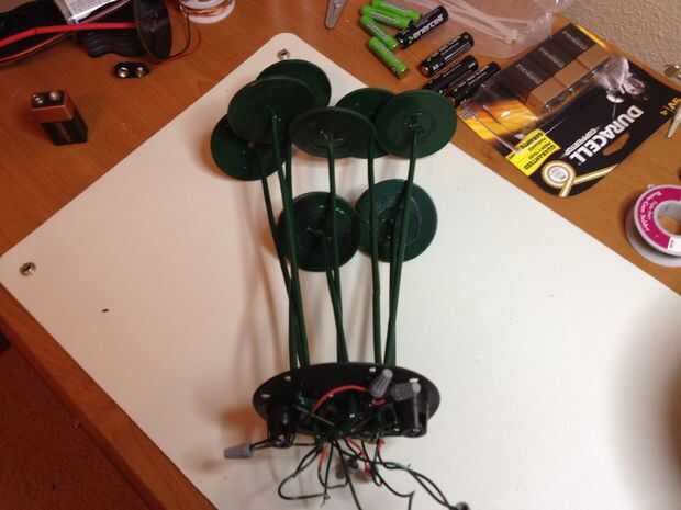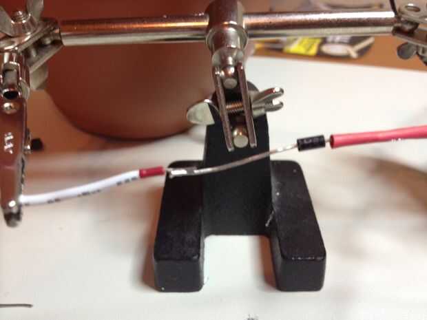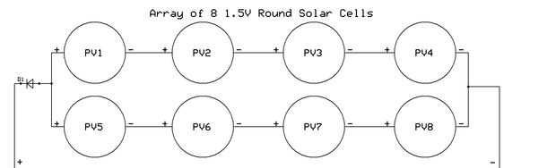 Después de que tuviera todos los tallos montados, alambré las células juntas en un circuito serie-paralelo como se muestra en el esquema. Entonces, he añadido un diodo de bloqueo para el positivo (rojo). Esto evita que la corriente inversa a través de las células cuando no hay sol luz.