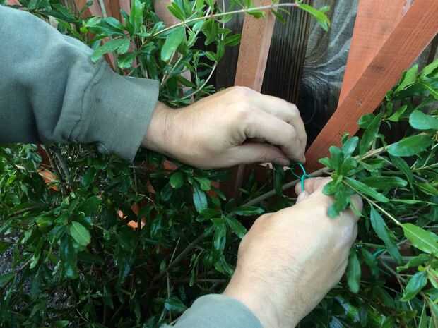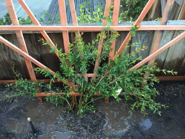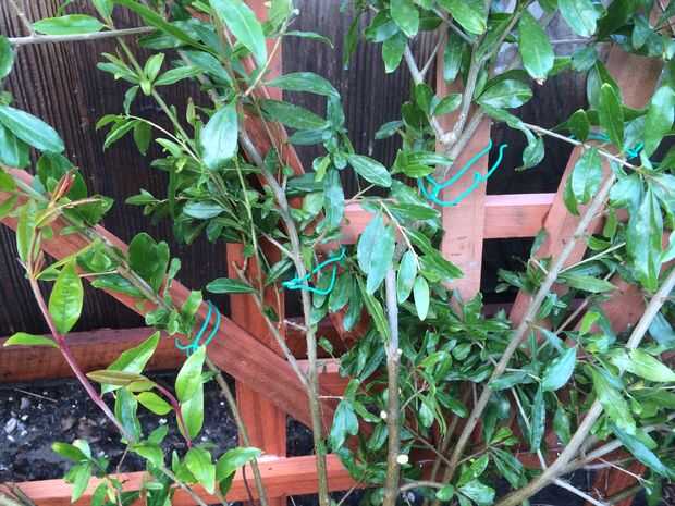Una vez que se han dispuesto a su gusto, nuevo recorte las ramas extras que no siguen su idea visual. Se trata de un proceso continuo como pasan los años. Imaginar cómo las ramas crecerá con el tiempo y elegir las ramas más fuertes para permanecer. Mi intención es que permanecen principalmente en la forma de la dirección del enrejado y bush tal vez hacia fuera sobre un pie a cada lado de la rejilla a medida que madura.