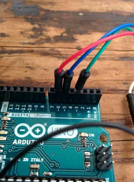 Luego até un alambre a 3 hilos de 3 LED. Básicamente 3 cables rojos fueron soldados a un cable rojo para reducir los cables redirigidos, y lo hice para los otros 2 colores y potencia. El hilo entonces fue alimentado en ciertos pines en el Arduino. Sin embargo, el cable fue alimentado en el 3.3v pin en el Arduino. Luego subo un código que se desvanece cada color del arco iris.