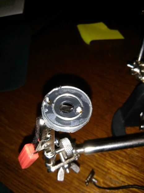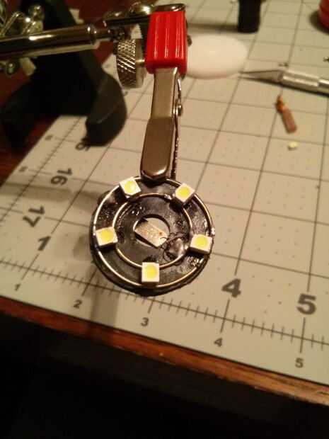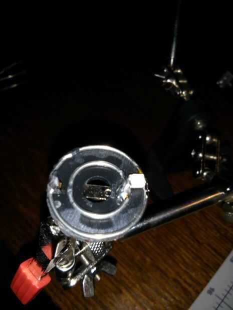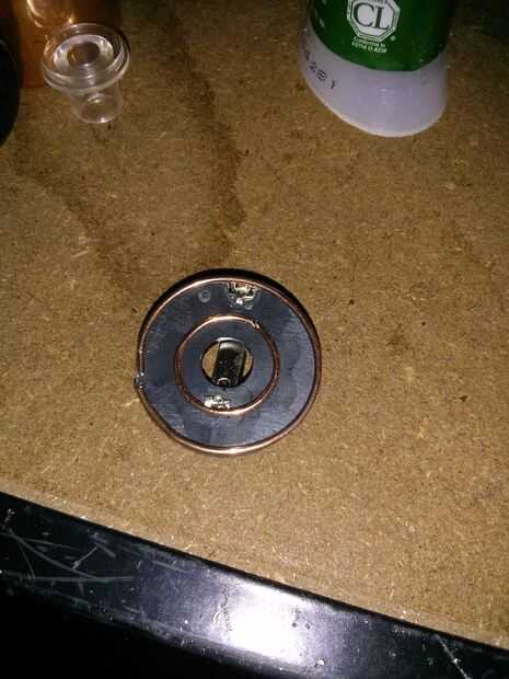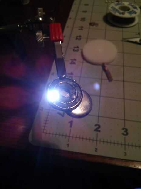 Para el centro LED fue un poco más complicado. Necesita soldar dos cables pequeños a él y al menos uno de ellos necesita el aislamiento del cable. Caliente pegué el LED en el centro de soporte de la batería. El lado negativo del LED Haz soldado al anillo interno y el lado positivo tiene que saltar sobre el anillo interior y obtener soldados para el anillo externo por lo que necesita para mantener el aislamiento del cable o le corta el LED hacia fuera.