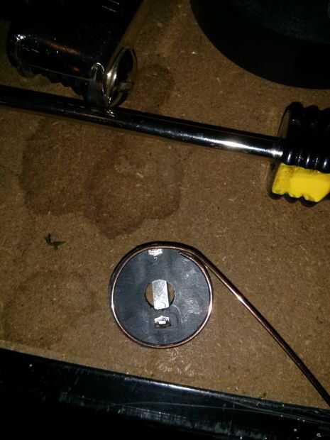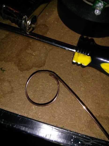 Encontré un alambre fino para hacer un anillo externo para montar los LEDs. Usted quiere hacer el círculo, por lo que es el mismo diámetro como el talud exterior. Puede envolver el alambre alrededor de un mango de destornillador o de un marcador para obtener un círculo perfecto. Una vez dejé el diámetro correcto soldado el círculo cerrado para completar el círculo. Entonces había soldado el anillo a la pestaña "+" (externo). Hice lo mismo para el anillo interior, pero éste tuvo que ser mucho menor por lo que pude soldar al "-" pestaña (interno). Así que ahora hay un positivo y un negativo anillo.