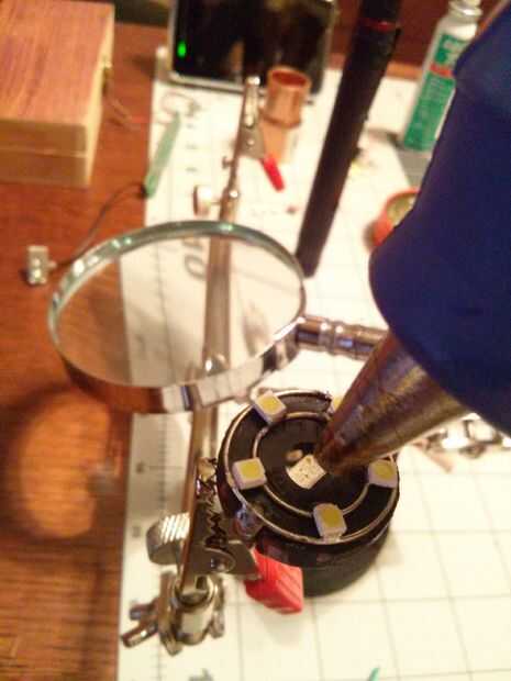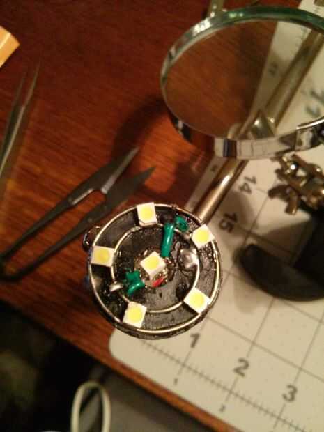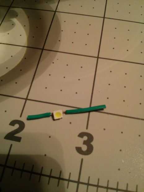 Una vez que había suelda cada LED en, le pongo la batería en comprobar. Usted quiere asegurarse de que usted no los abrasará al soldar. Colocar el lingote de nylon sobre las luces brillantes para ver cómo se veía.