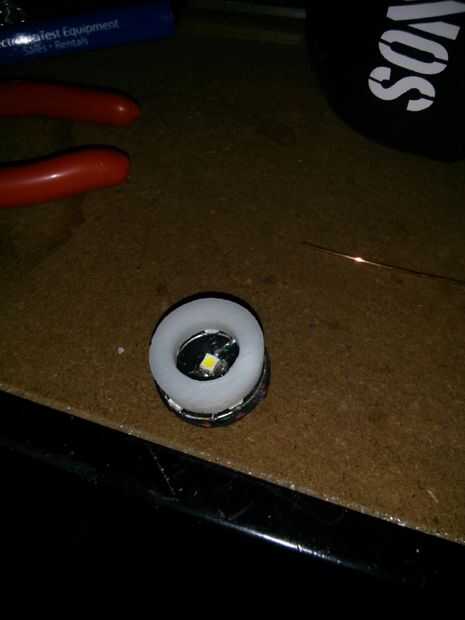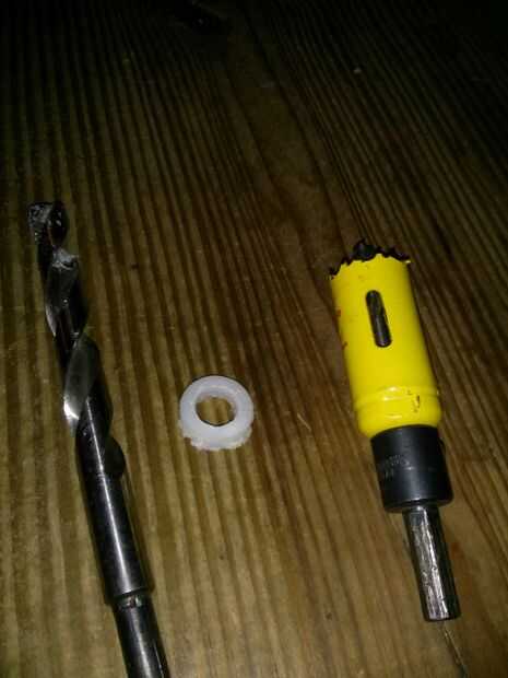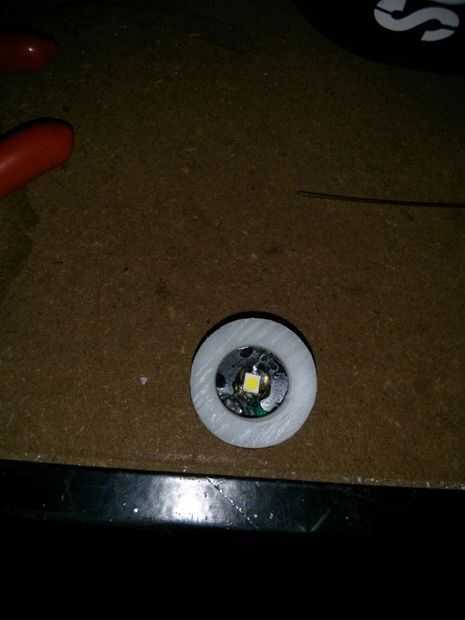El anillo de nylon fue hecho de una barra maciza de 2" diámetro de nylon. Necesita ser por lo menos el mismo diámetro que el soporte de la batería. También se podría utilizar una arandela de nilón grueso pero no pude encontrar ninguna. Corté un trozo de varilla de 1/4" de espesor para mi lente. Luego utiliza un 1" serrucho para cortar el diámetro exterior y utiliza una broca de 3/8 para agujerear el centro. Luego reviso el anillo para asegurarse de que cubre todos los LEDs.