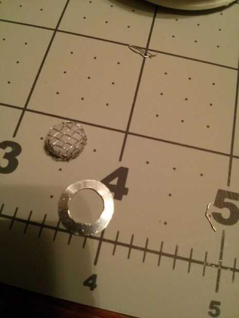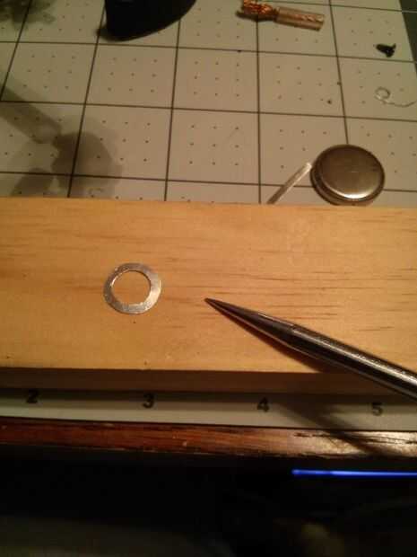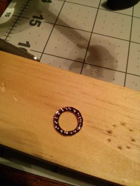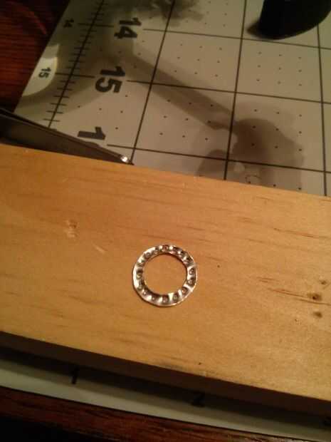 Usé un asombro para perforar el orificio todo el camino alrededor del anillo. Entonces yo cortar tres pequeñas lengüetas que llevarán a cabo otro anillo. He pegado las tres fichas a la anilla de metal y había pintado negro.