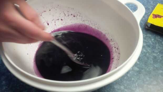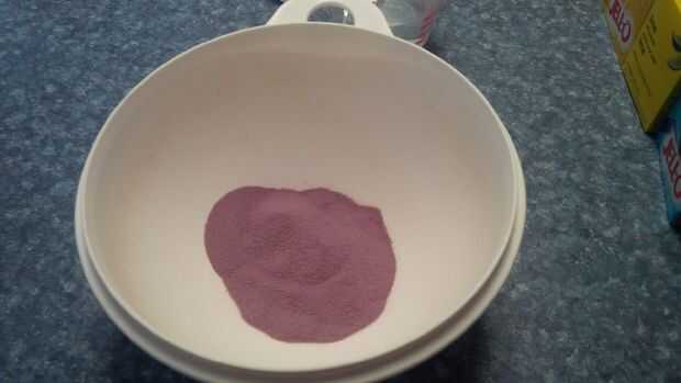 Vierta el polvo de gelatina de uva en tazón de fuente.