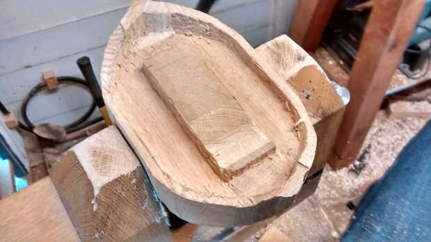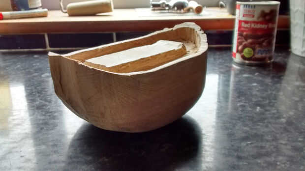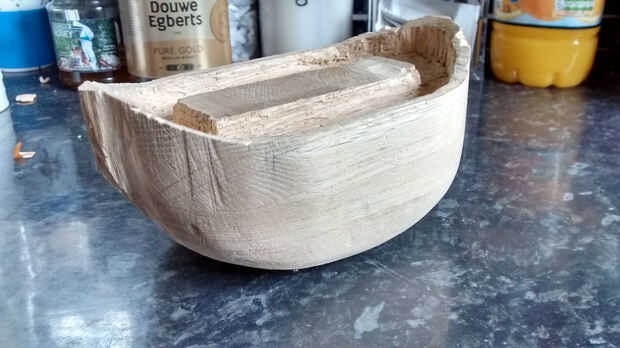 Luego fue tallado del casco (lo siento perdí la foto de esto) y luego dijo con voz áspera a un acabado más uniforme. Luego trabajé en la cubierta. Una línea de 1cm se marcó todo el camino alrededor de la cubierta y luego esto fue tallado hacia fuera. Me decidí a dejar parte de la sección central con la cara del extremo del grano para crear a una especie de espiga de la cubierta de la cabina.