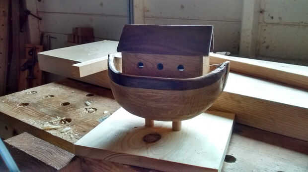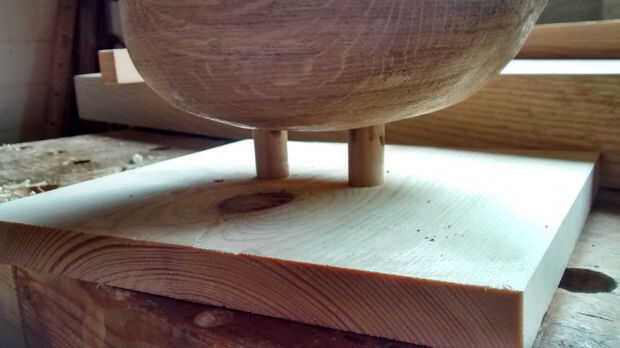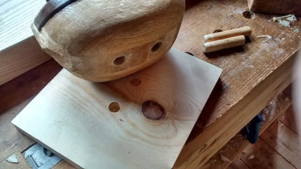 Ahora una base necesaria para ser agregado para mantener estable el arca. Ya siente bastante estable, pero quería montar. Esta versión sería más para la exhibición de un juguete. Aburría en la parte inferior de la arca, usando los agujeros que se utilizan para montar el bloque de montaje y hacen dos agujeros de 16mm en el casco. Luego utilicé la pieza de madera que solía Sierra original la forma de las arcas para hacer los dos agujeros correspondientes en la base. Éstos tenían entonces aburrido en ellos con una broca forstner de 15mm dos orificios. Dos longitudes de 16mm espiga (salvado de algo que iba a lanzar hacia fuera) entonces fueron pegados en la base (no el final del arca pero como necesito quitarlo para trabajar más en la base).