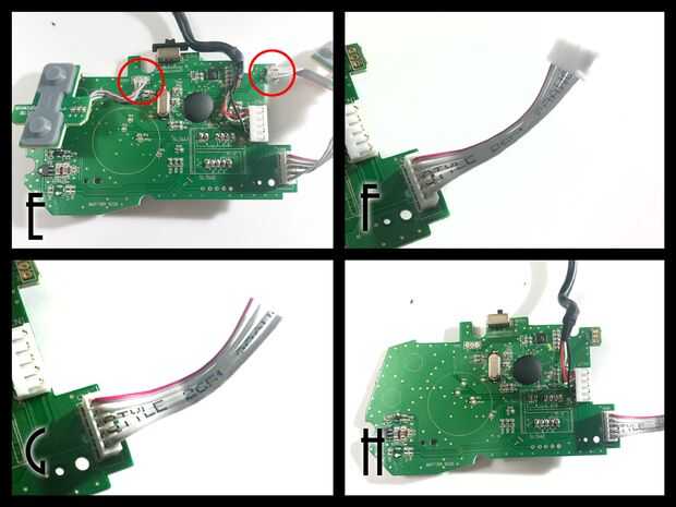 4. la figura E - quitar el pegamento que cubren puntos de gatillo en el tablero, generalmente viene justo al lado. Después de soldar los puntos. (Consejos: es mejor que quite individualmente cada cable tirando de él mientras que el lado opuesto con el soldador de la calefacción.