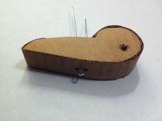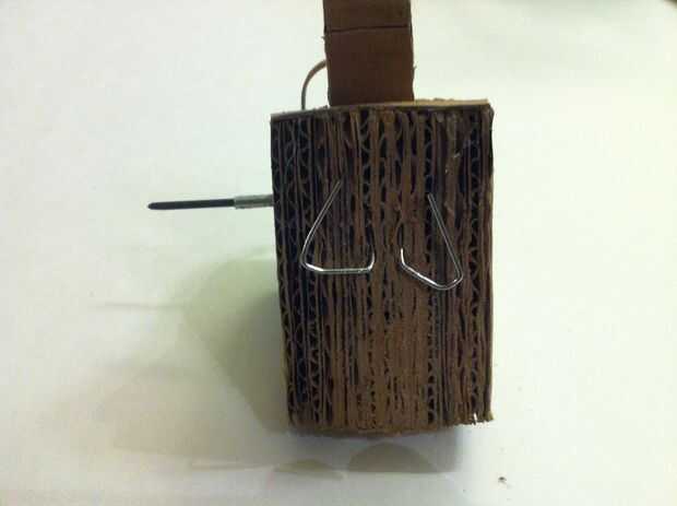 Dobló clips de papel en un ojete apretado en forma de U que enviado totalmente a través la carne de la gruesa laminado cartón y doblar sus extremos para evitar sacar de sí mismo.