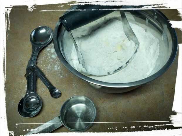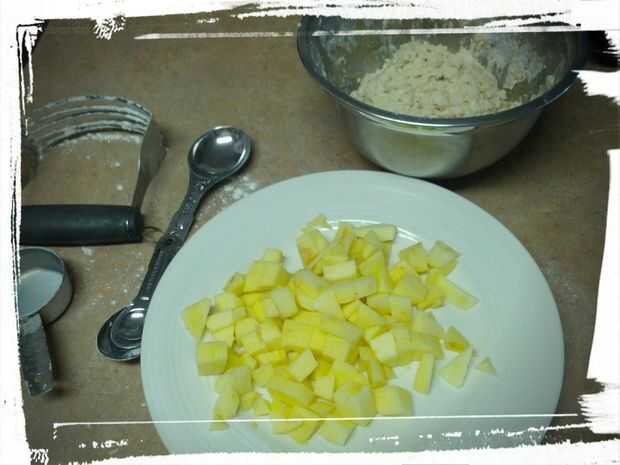 Mezclar la harina, polvo de hornear y la sal y cortar en la mantequilla hasta que se ve como guisantes. Mezclar la leche y reservar la masa. Va a ser grumosa y húmeda, pero eso es aceptable!