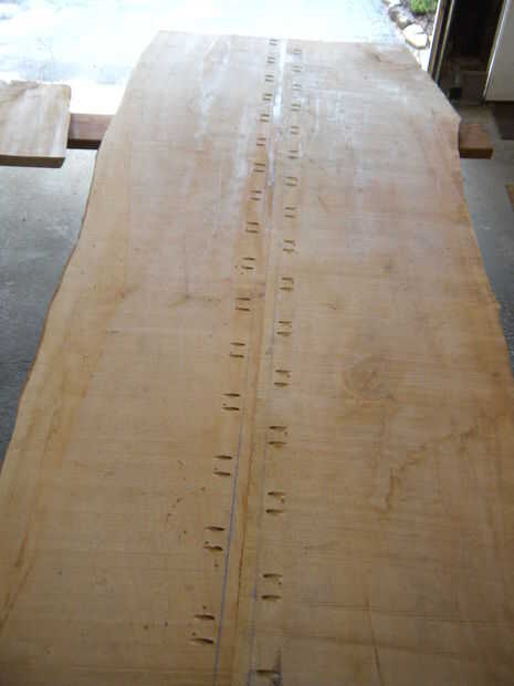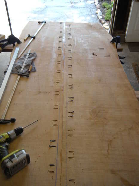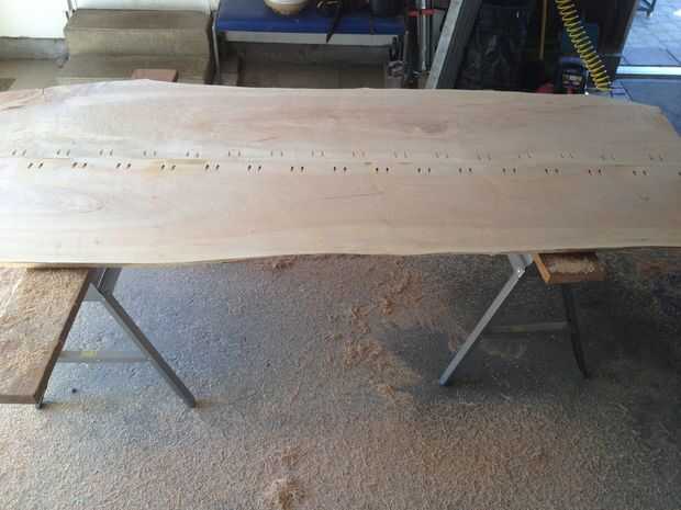 Después de la cola para arriba, lo dejo reposar 24 horas para "colocar" un poco. Luego usé un cepillo de poder Harborfreight al áspero-plano de la parte inferior - hay una necesidad real que como práctica para cuando hago la parte superior - solo planeaba finalizar la parte superior con el aceite de tung y la parte inferior con el exterior casa pinturas Base #5. Esto me dio una superficie de buena práctica para perfeccionar mi técnica como ilustrado aquí.