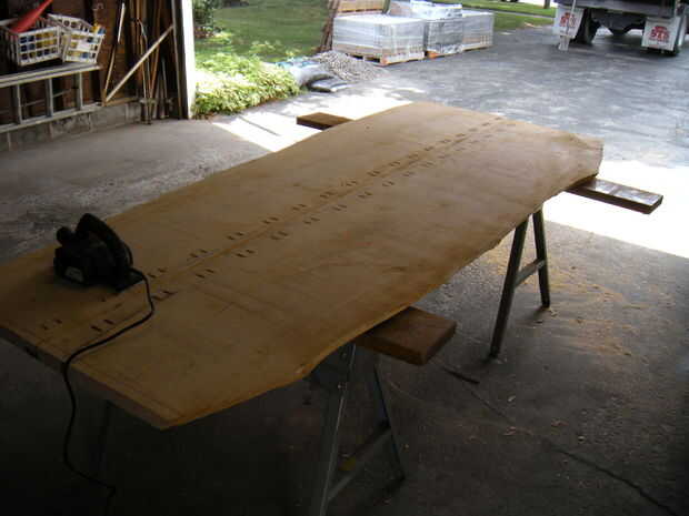 Desde entonces he tenido la oportunidad de construir una plantilla basada en router para aplanar - como este - esto habría sido digno de la época conocía - y gvien me una superficie mucho más bonita, más plana - aunque con mucho más trabajo. Puesto que esto era basiclly va a ser un souped encima de mesa de picnic, estaba menos preocupado por lograr un acabado de espejo liso y mucho más para proteger la madera contra los elementos. Si esto fuera una mesa de comedor interior, utilice un router para obtener ese hermoso acabado plano.