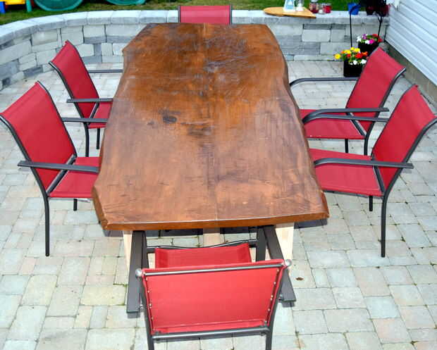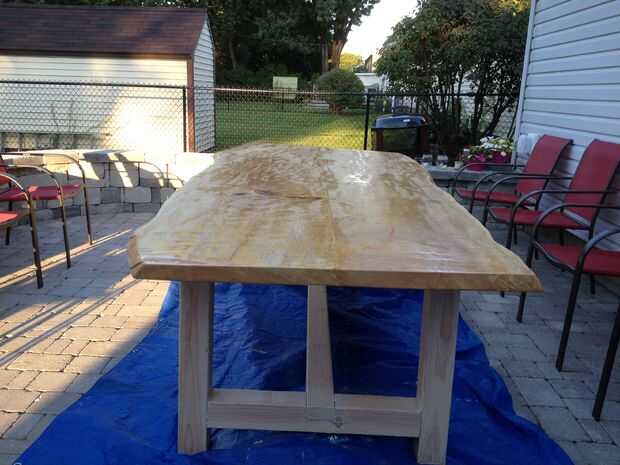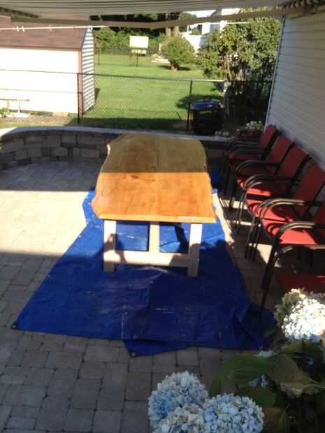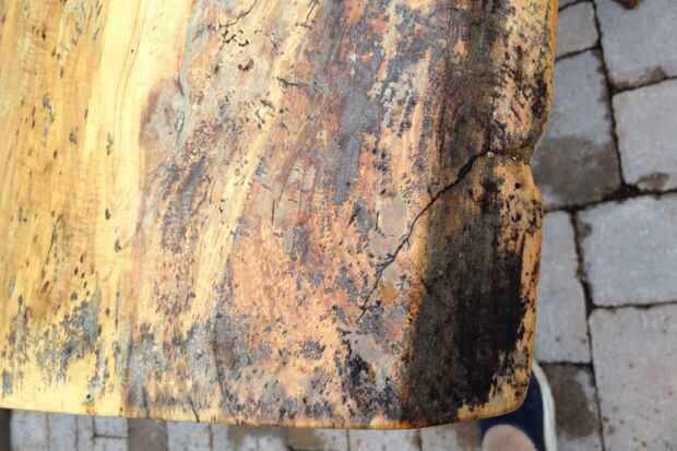 Hace ya 9 meses he construido la tabla y uno de los inviernos más fríos en expediente - el acabado sobrevivido muy bien. Sin embargo, en la inspección esta primavera, me di cuenta de algunas manchas negro en el acabado. Alrededor de mediados de abril, he podido examinar más de cerca y parece que hay algunos moho en partes de la mesa, se ve terrible. Hablé con varias personas y confirmaron que algo fue en la madera antes de sellar. Así, que tuve que tira el aceite de Tung, tratar la mesa con Concrobium - un asesino de algecide/molde/prevención. Usé el cepillo otra vez, esta vez no me preocupó con un espejo acabado - desde que se fuera, era un aspecto rugoso.