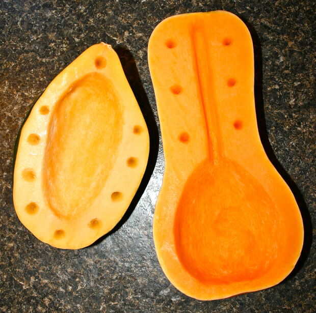 Cortar la calabaza por la mitad y sácale las semillas en su interior.