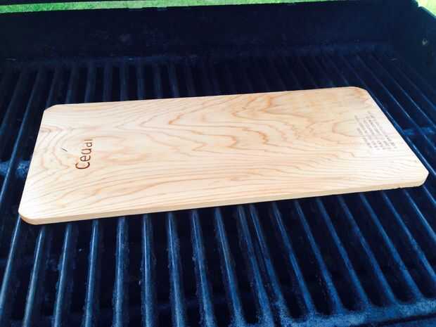 Precalentar parrilla en lo alto. Cuando temp alcanza ~ 425F, Jiao medio inferior al medio y lugar de tablón de cedro sobre el Jiao Medio. Si no tienes un quemador central, reduzca el calor al medio en la estufa.