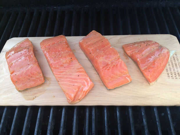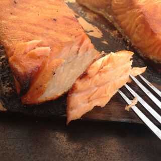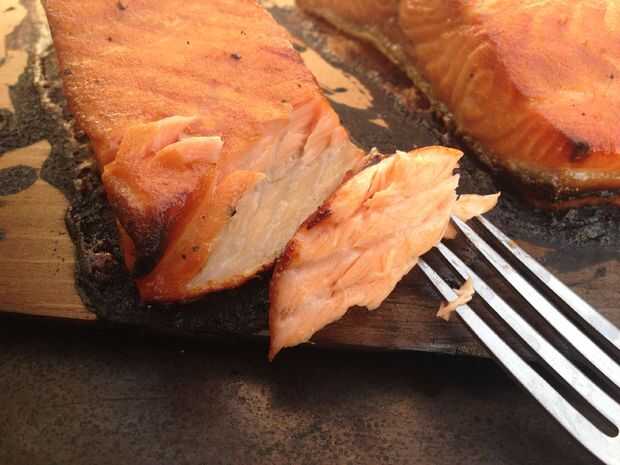 Lugar de salmón en la plancha de cedro como se muestra en la imagen. Me gustaría ir en un ángulo ligero para que los bordes no se demasiado crujientes.