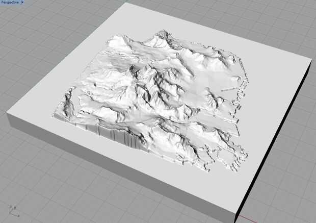 Había importado el archivo .wrl en software de modelado de Rhino. Primera orden de negocio fue cambiar el tamaño de la geometría de la malla a mi corte dimensiones materiales. Utilicé la herramienta cubra para crear una superficie lisa y limpia topográfica con una base plana. La base y la topografía se clasifican para poder dentro del volumen dimensional del material cortado. (Me costó originalmente importar mi geometría en Autodesk Inventor para crear las rutas de archivo. Luego volví en ArcScene para crear una superficie de lata con menos detalle por abajo muestreo mi raster DEM. Creo que podría lograrse un efecto similar mi reduciendo la malla cuenta en Rhino antes de cubrir.)