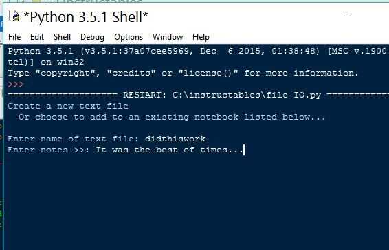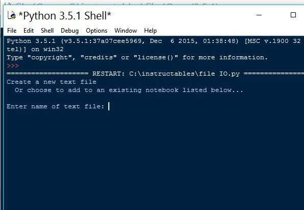 La segunda foto es el módulo de ejecución del archivo file_IO.py. Tenga en cuenta que no hay nombres de archivo aparecen después de las instrucciones. (Esta es una buena señal puesto que hay ningún archivo de texto, si uno se muestra la ubicación en la secuencia de comandos de Python no es 'apuntada' la ubicación de la carpeta correcta.)